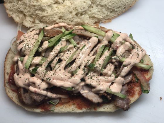 Свинина, зелень, огурец, помидор, соус.