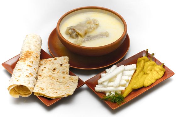 Состав: бульон, мясо с костями (говяжие ножки)+ лаваш, соленье, чесночный соус, сыр, зелень, дайкон