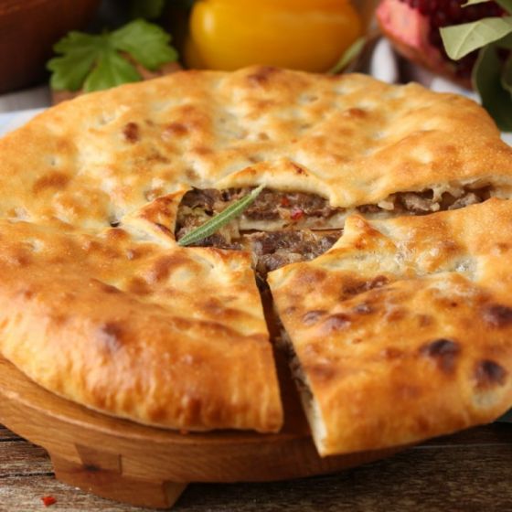 Сосав: тесто, свинина, сыр, зелень, специи
