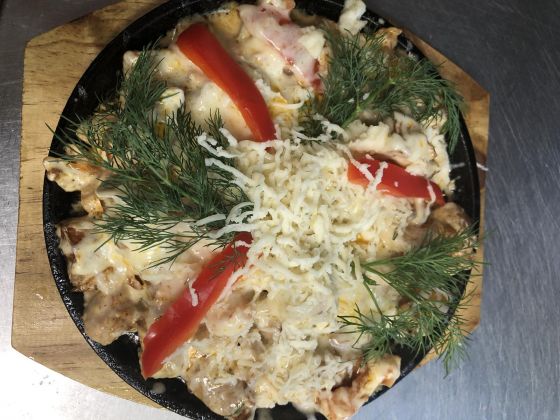 Состав: куриное филе, шампиньоны, сливки, картофель-фри, сыр сулугуни, специи