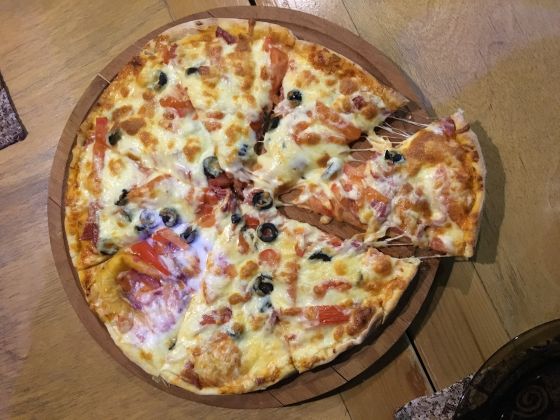 Состав: тесто, сыр сулугуни, томатный соус, сервелат, маслины, специи