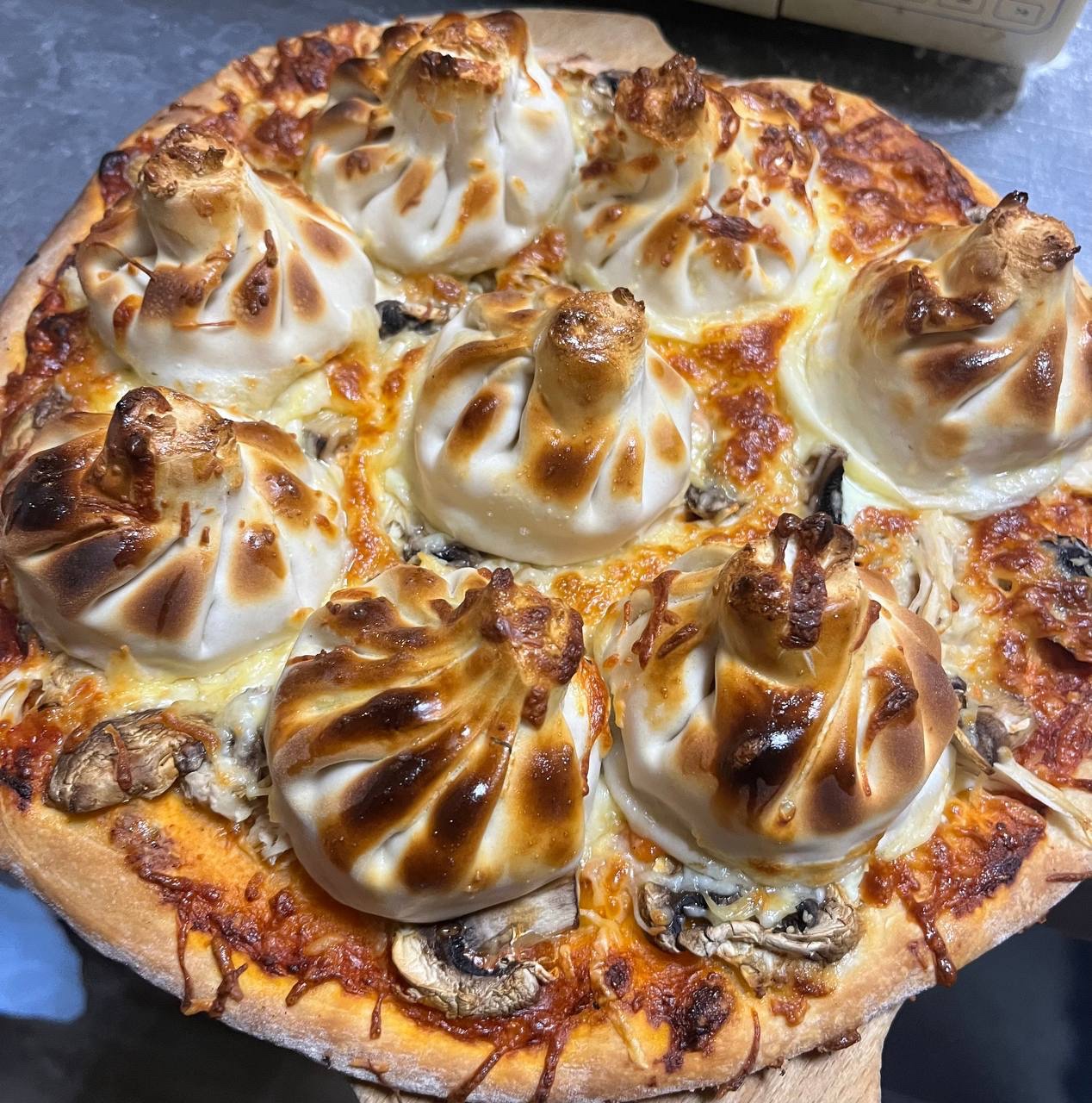 Пиццапури с сыром сулугуни, куриным филе, грибами и специями, плюс сверху запеченый сыр в форме хинкали